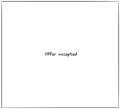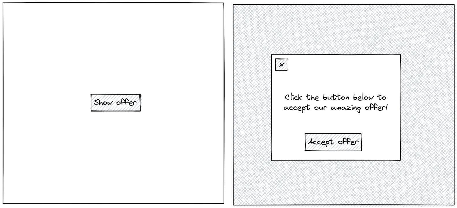 If the user clicks anywhere on the grey background or the 'x', the modal should be dismissed and the UI should again just show the 'Show offer' button. However, if the user clicks the 'Accept offer' button, the modal will dismiss and the UI should now show the text "Offer accepted".