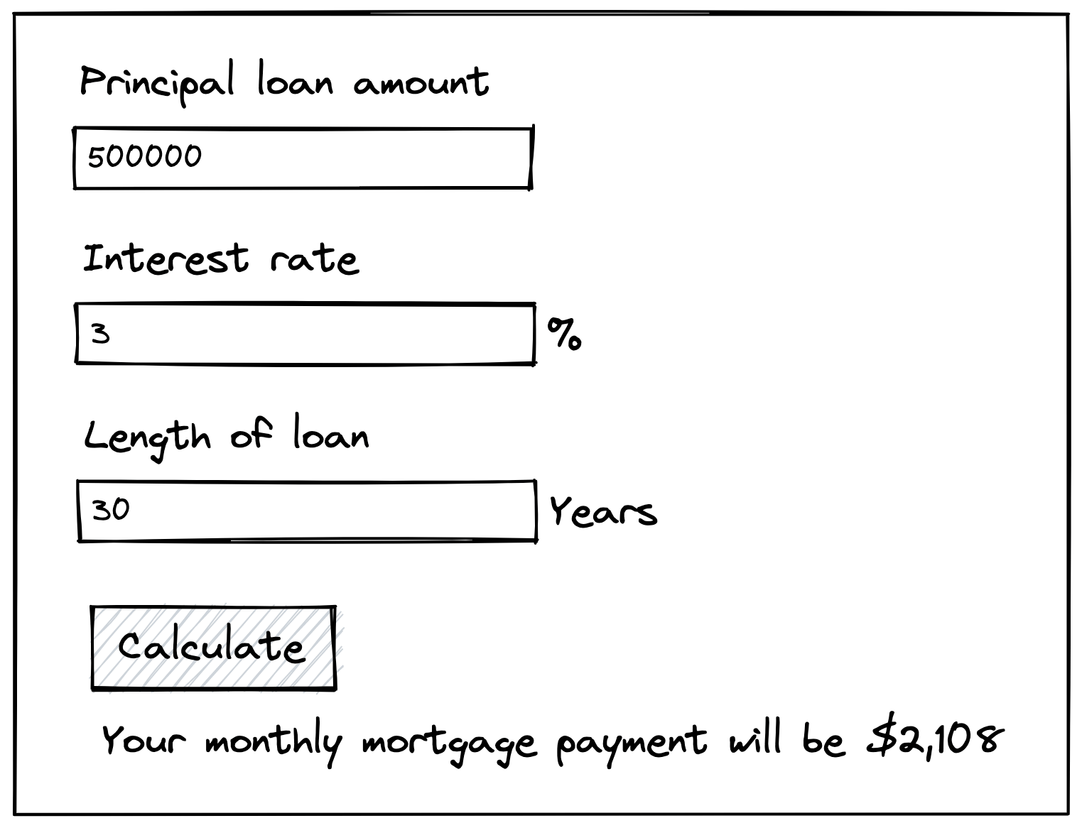 Note the bolded differences between the equation variables and the inputs. The inputs are set up that way as a matter of user experience: borrowers tend to be presented numbers like this by their bank. Your job when working on this feature is to convert the user inputs into the numbers that will be used in the calculation. Users will make 12 payments on their mortgage per year of their mortgage, and the monthly interest rate is the annual interest rate divided by 12.